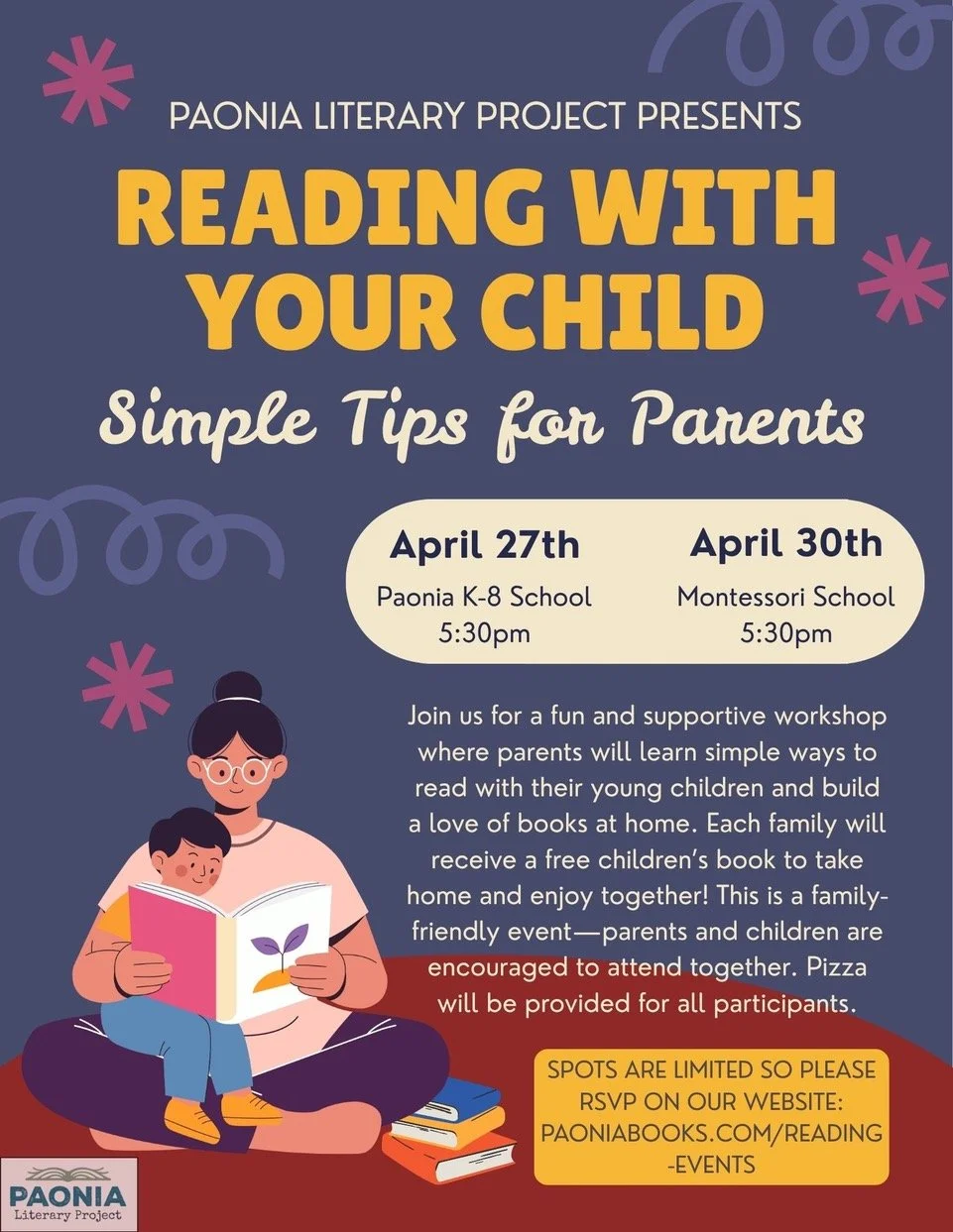 Spend a fun hour with Paonia Literary Project and your young child (ages 0-pre-k) and get a free book and pizza! We’ll have a brief presentation with concrete ideas about how help young children get excited about books, you and your child can choose to take a book home, and PIZZA.