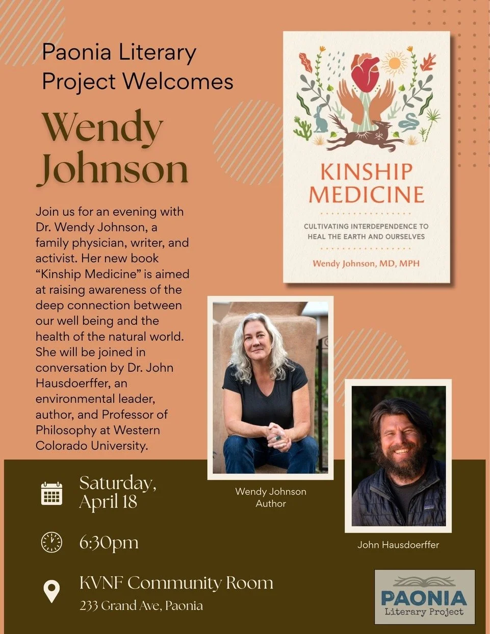 On Saturday, April 18th, The Paonia Literary Project welcomes Wendy Johnson, a family physician, writer, and activist, who will be giving a talk on her new book, “Kinship Medicine”. Wendy will also be joined in conversation by John Hausdoerffer, an environmental leader, writer, and Professor of Philosophy at Western Colorado University.